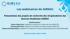 Nous sommes ravis de vous inviter à notre prochain webinaire, qui aura lieu le jeudi 30 octobre à 12 h. Cette session comprendra des présentations intéressantes sur les projets de recherche des trois récipiendaires des bourses étudiants GIREAU.